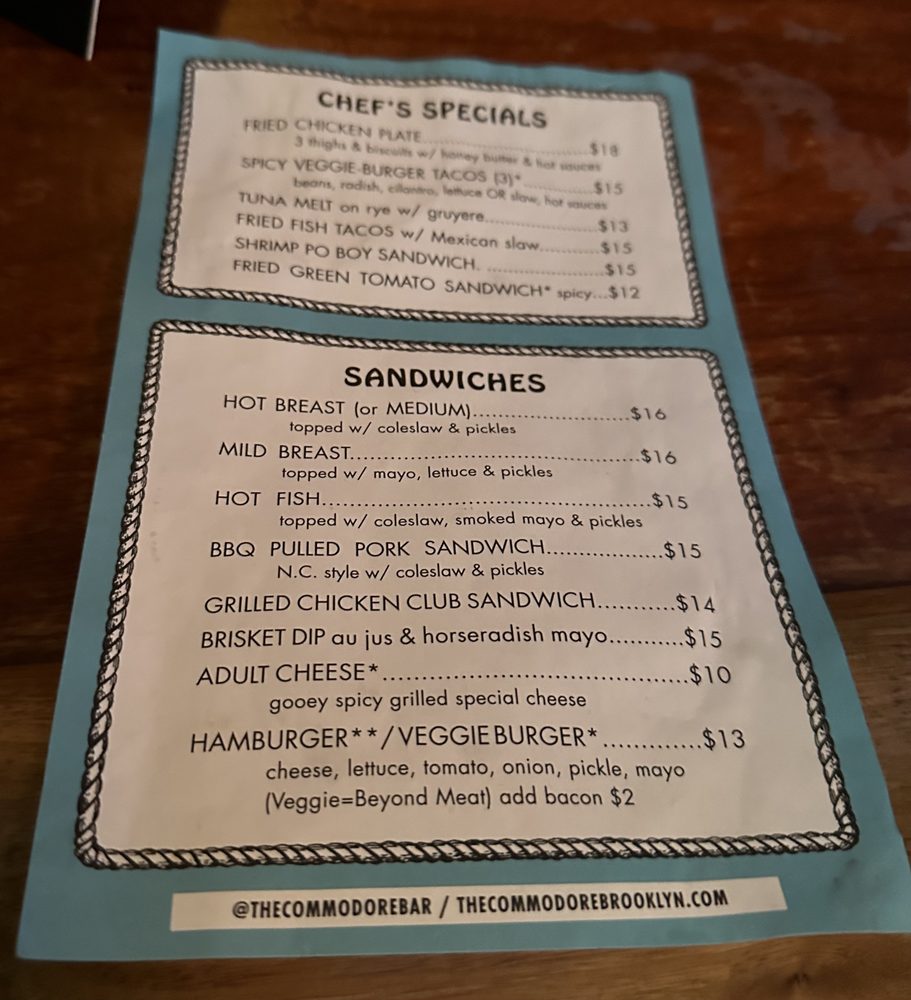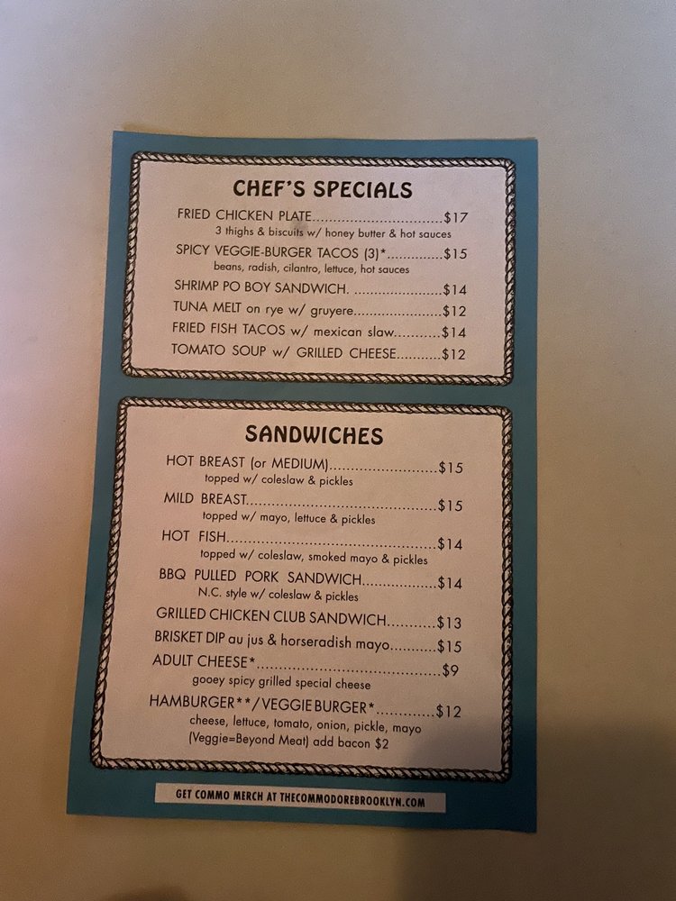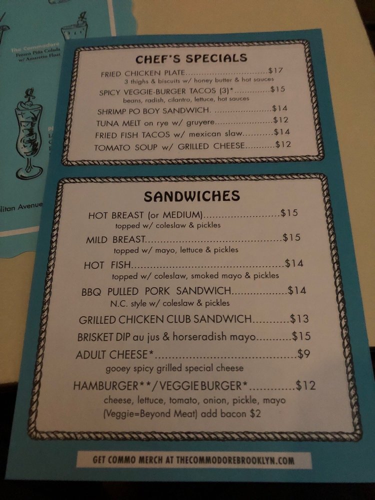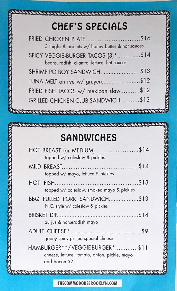 The Commodore in Brooklyn, NY, is a must-visit spot for American-style bar food. With a range of sandwiches like the Hot Breast, Fish, and Adult Cheese options, there is something for everyone. The Chef's Specials, including the Fried Chicken Plate and Shrimp Po Boy Sandwich, are juicy and flavorful. The sides like Cadillac Nachos and Kale Caesar Salad offer a great balance to your meal. Customers rave about the friendly service and delicious cocktails, making it a perfect spot for late-night bites or casual dining. The casual dive bar atmosphere adds to the relaxed dining experience. Don't miss out on trying the iconic fried chicken and exploring their creative drink menu at The Commodore.